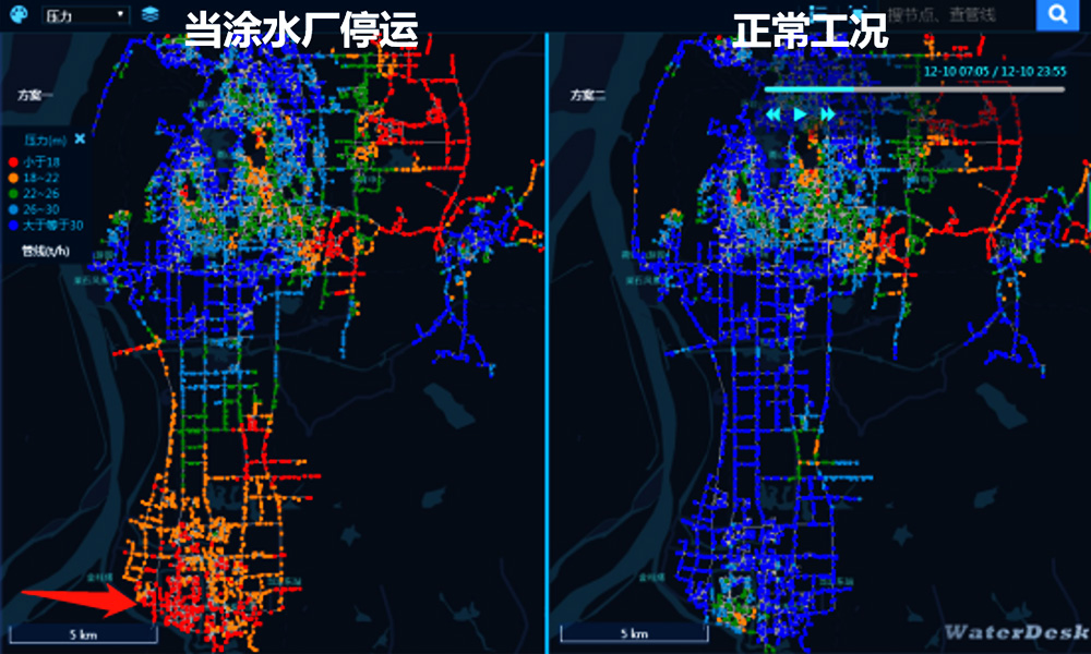 • 应用数字孪生技术,动态掌握管网全参数运行状态,实现数据分析与模拟评估,为水司提供管理调度与决策支持。
