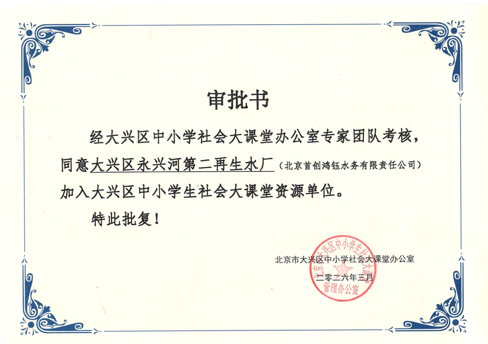 310日,首创鸿钰被北京市大兴区中小学社会大课堂办公室授予“大兴区中小学生社会大课堂资源单位”荣誉称号。